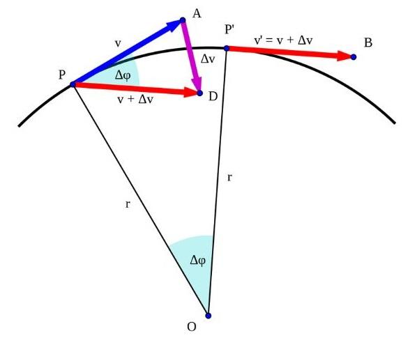 En la figura de la derecha se ve que la magnitud de Δv, el cambio en la velocidad, es aproximadamente proporcional a Δl, ya que el ángulo Δφ es pequeño. Pero el cambio en la velocidad está relacionado precisamente con la aceleración. Del triángulo se advierte, por suma de vectores, que: