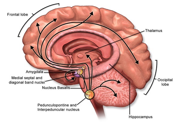 Estos tres elementos se encuentran en las regiones específicas del cerebro donde se producirá acetilcolina, por ello, confecciona un neurotransmisor perteneciente a un sistema específico, el sistema colinérgico.