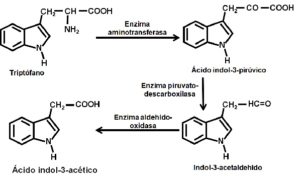 El triptófano, mediante la enzima aminotransferasa, pierde un grupo amino y se convierte en ácido indol-3-pirúvico. Este pierde un carboxilo y se forma el indol-3-acetaldehído gracias a la enzima piruvato descarboxilasa.