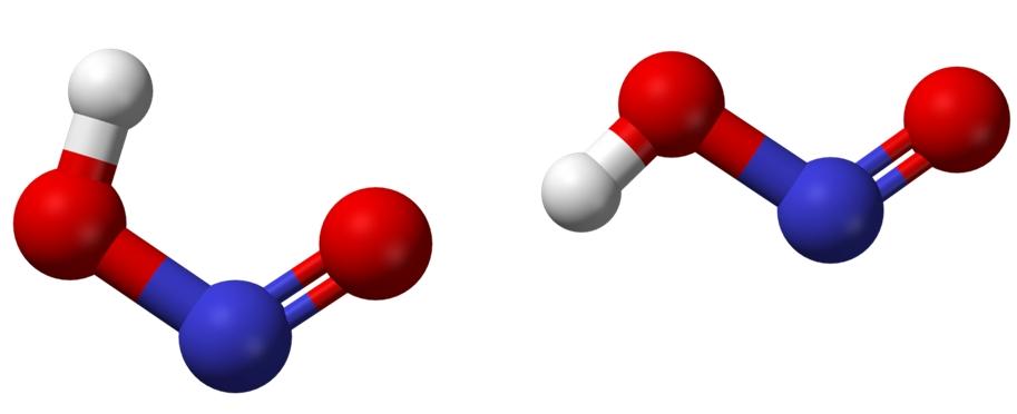 En la imagen superior se muestra la estructura molecular del ácido nitroso mediante un modelo de esferas y barras. El átomo de nitrógeno (esfera azul) se sitúa en el centro de la estructura, formando un enlace doble (N=O) y uno sencillo (N-O) con los átomos de oxígeno (esferas rojas).