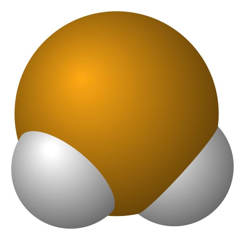 La molécula de H2Se es de geometría angular, aunque su ángulo de 91° hace que se parezca más a una L que a una V. En este modelo de esferas y barras, los átomos de hidrógeno y el del selenio son las esferas de color blanco y amarillo, respectivamente.