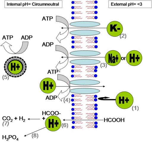 – Acidez, un problema a resolver. Los acidófilos parecen compartir características estructurales y funcionales distintivas que les permiten neutralizar la acidez. Estos incluyen membranas celulares altamente impermeables, una alta capacidad reguladora interna y sistemas únicos de transporte. Debido a que los acidófilos viven en un ambiente donde la concentración de protones es alta, han desarrollado sistemas de bombas encargadas de expulsar los protones al exterior. Esta estrategia logra que el interior de la bacteria tenga un pH muy cercano al neutro.