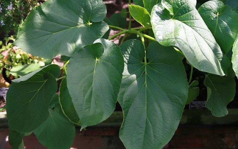 • Hojas. Son simples y alternas, de formas variables: oblongas, obovadas o acorazonadas, de 20-35 cm de largo y 12-25 cm de ancho. De ápice agudo y borde asimétrico, ligeramente pubescentes y aromáticas, son verde olivo claro, con un peciolo alado de 5-12 cm de largo.