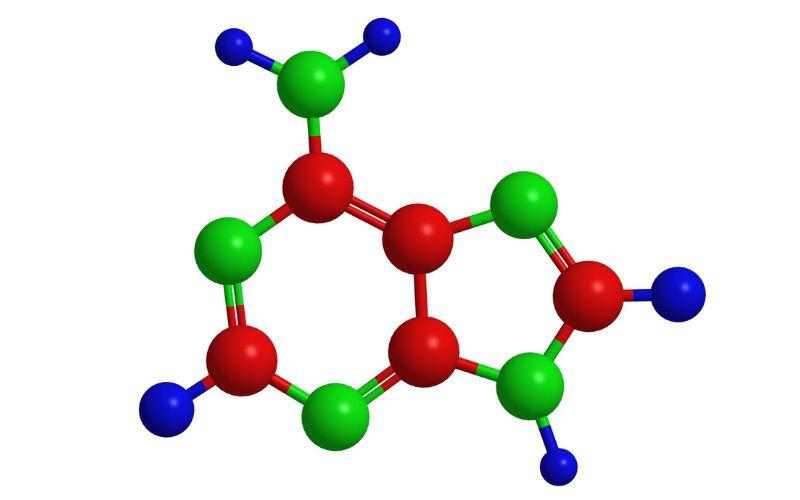 - Estructura química. Doble anillo con dobles enlaces conjugados, que es la fusión de una pirimidina con un grupo imidazol. Debido a ello, la adenina es una molécula heterocíclica plana.