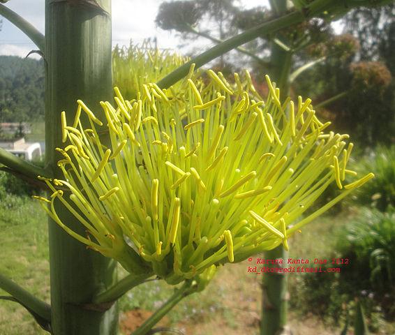 - Experimenta el fenómeno de monocarpismo, es decir, florece una vez al final del ciclo vegetativo: produce una inflorescencia terminal con un escapo semileñoso de más de 8 m de altura que se ramifica en pequeñas panículas.