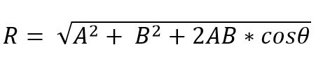 Cuando dos vectores forman un triángulo o paralelogramo, el m[odulo y la dirección del vector resultante puede ser determinado usando la leyes del seno y coseno. Así, el módulo del vector resultante, aplicando la ley del coseno y por el método del triángulo, es dado por: