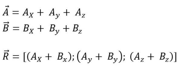 Se puede hacer trasladando los vectores que se van a sumar o restar hacia el origen de coordenadas, y luego se descomponen en sus componentes rectangulares todas las proyecciones en cada uno de los ejes para el plano (x, y) o el espacio (x, y, z); por último, se suman sus componentes algebráicamente. Entonces, para el plano es: