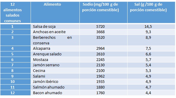 Los alimentos salados comunes más consumidos son la salsa de soja, alimentos del mar en conserva, la salsa de mostaza, productos de charcutería, frutos como las aceitunas y las alcaparras, los quesos, los chips de patatas, el pan blanco de barra y los cereales ricos en fibra.