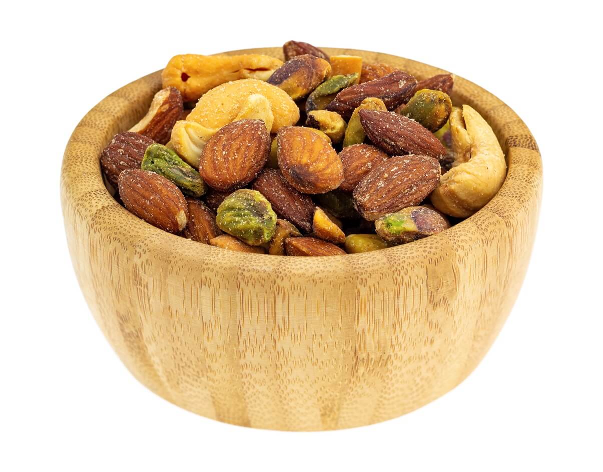Los frutos secos por sí solos son una botana saludable, brindan grasas, fibras y proteínas sanas. Propiamente no tienen sodio, pero la mezcla de diferentes frutos secos a menudo le agregan sal. La cantidad de sal dependerá de la marca y la cantidad de frutos, pero los ligeramente salados tienen aproximadamente unos 55 mg de sodio por cada 100 g.