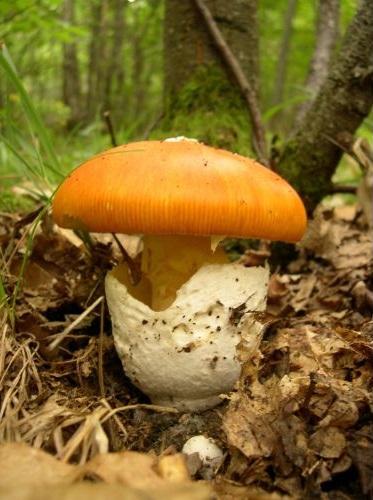 - Amanita caesarea. Conocida como seta del César, oronja o huevo de rey. Su cuerpo fructífero presenta un sombrero de hasta 20 cm de diámetro, que originalmente es semiesférico y se va aplanando con el tiempo. Sus láminas y su estípite son ocre intenso y posee una volva grande, blanca y membranosa. Puede establecer relaciones con árboles de distintas especies como coníferas, castaños, alcornoques, encinas y robles. El cuerpo fructífero aparece entre verano y otoño en Europa meridional y puede ser confundido con Amanita muscaria, de la cual se diferencia porque esta última presenta láminas y estípite blancos en lugar de ocres. Su sabor y su aroma son muy agradables y puede ser consumida incluso cruda.