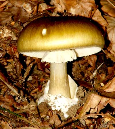 - Amanita phalloides. Conocida como hongo de la muerte, es la especie más mortífera para los seres humanos. Una de las causas del elevado número de fallecidos es que se confunde fácilmente con algunas especies comestibles. Presenta un sombrero semiesférico que se aplana con el tiempo y que puede alcanzar hasta 15 cm de diámetro. Su color es verde oliva, más claro hacia los bordes, aunque algunos ejemplares pueden ser más claros e incluso blancos. Las láminas son ligeramente grisáceas y el pie es anillado y blanco, con escamas verdosas irregularmente dispuestas. Las toxinas de este hongo afectan el hígado y los riñones y pueden ocasionar un síndrome denominado falodiano, de acción lenta y de difícil identificación. También puede causar fallo hepático. Generalmente es necesario el trasplante hepático cuando se presenta el síndrome falodiano. Existe un antídoto desarrollado por el instituto Pasteur, pero es de eficacia limitada.