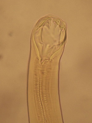 Detalle del extremo cefálico de Ancylostoma duodenale. Fuente: Rjgalindo from es CC BY-SA 3.0, Wikimedia Commons