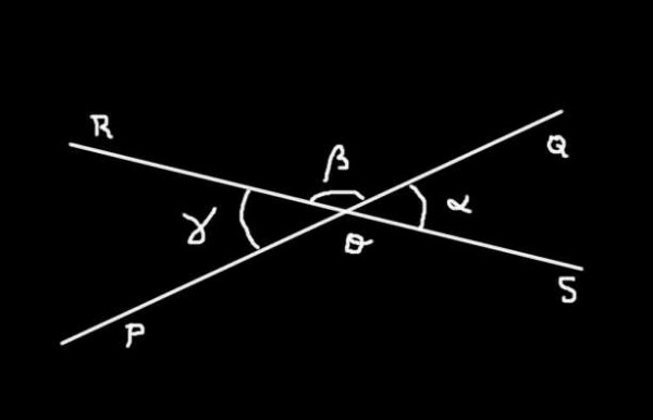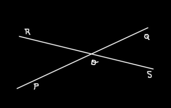 La imagen superior muestra las dos rectas (PQ) y (RS) que se interceptan en O. Allí puede verse que se determinan cuatro ángulos: