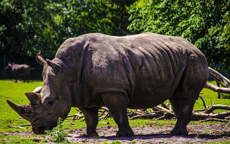 La combinación de sus cuernos afilados y su inmenso volumen ayuda a protegerse de otros mamíferos depredadores, mientras que su carencia casi absoluta de pelo corporal impide que se sobrecalienten en el calor tropical de sus tierras de origen.