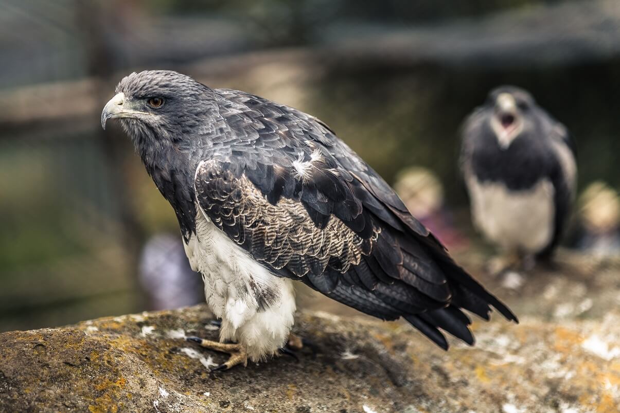 Mide 70 centímetros de longitud y cuentan con un pelaje negro, gris y blanco, pico negro y patas amarillas.