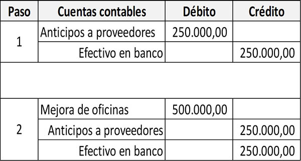 En el paso número 1, la compañía XYZ pagó un anticipo del 50% por la mejora de sus oficinas, que tiene un costo total de $500.000. Por el pago realizado se procede a debitar la cuenta de Anticipos a proveedores para incrementarla y a acreditar la cuenta de Efectivo.