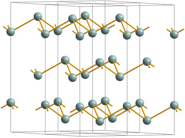 En la imagen superior se muestra la estructura de capas arrugadas adoptada por los átomos de arsénico. No obstante, el antimonio grisáceo, más conocido como antimonio metálico, también adopta esta estructura. Se dice que es “arrugada” porque hay átomos de Sb que suben y bajan del plano compuesto por la capa.