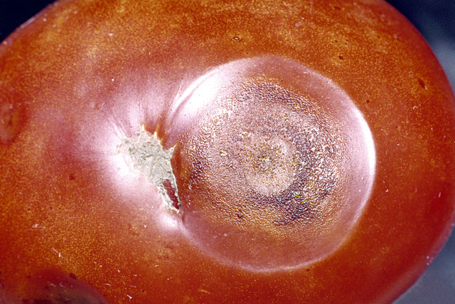 La antracnosis del tomate se presenta en frutos muy maduros que están en contacto o cerca del suelo. El agente causal es el hongo ascomiceto Colletotrichum coccodes. Los primeros síntomas se presentan como lesiones circulares y hundidas de 10-12 mm sobre la superficie de los frutos.