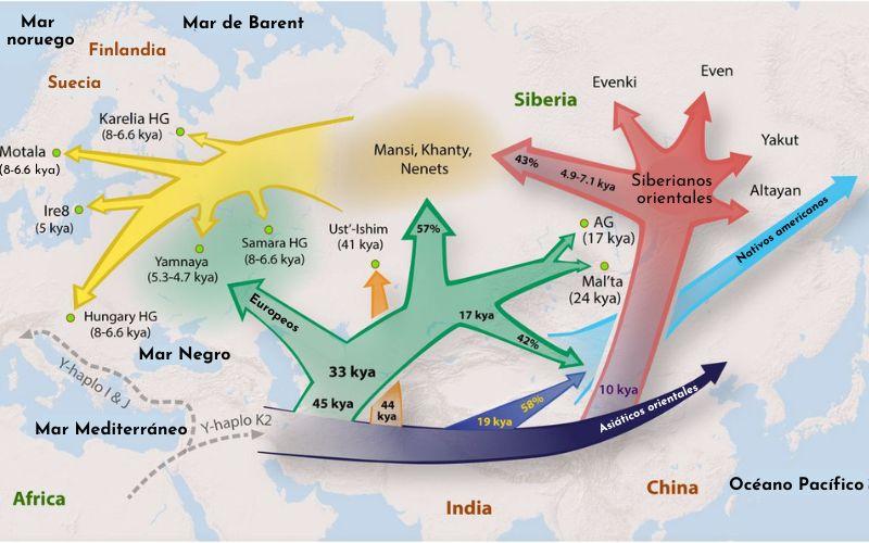 Modelo de dispersión geográfica humana (Eurasia) basado en datos arqueogenéticos. Fuente: Emily H.M. Wong1, Andrey Khrunin2, Larissa Nichols2, Dmitry Pushkarev3, Denis Khokhrin2, Dmitry Verbenko2, Oleg Evgrafov4, James Knowles4, John Novembre5, Svetlana Limborska2 and Anton Valouev1, CC BY-SA 4.0, Wikimedia Commons