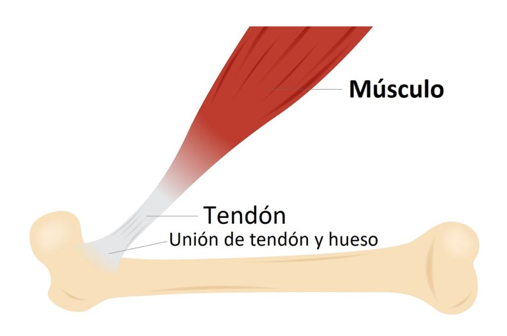 Los músculos pueden unirse al sistema esquelético a través de unas estructuras conocidas como tendones. Un tendón es una estructura formada por fibras de tejido conectivo (principalmente colágeno) que se encuentra en los extremos de los músculos y cumplen la función de sujetarlo o unirlo al tejido óseo.