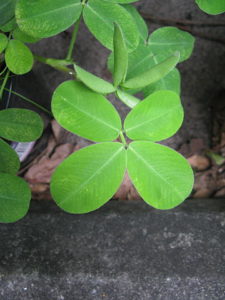 – Hojas. Las hojas del maní forrajero son alternas, formadas por cuatro folíolos, el color es verde intenso u oscuro y la forma de las hojas es aovada.