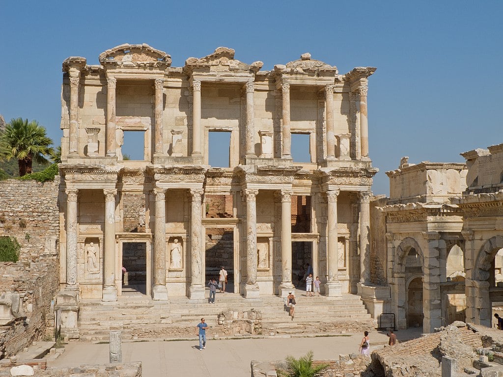 Ejemplo de arquitectura griega cuando ya se encontraba bajo dominio romano, esta biblioteca construida en Éfeso (actual Turquía), de estilo corintio, llegó a ser la tercera biblioteca más grande del mundo antiguo.