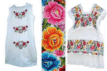 Las mujeres indígenas de las comunidades de Santa Rita, Xcupil, Tenabo, Hopelchén, Hecelchakán y Dzibalché elaboran fastuosos bordados (a mano y a máquina) de tiras floreadas en vivos colores.