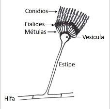 El conidióforo está formado por tres estructuras bien diferenciadas: la vesícula, el estipe y la célula pie que enlaza con el resto de las hifas. Sobre la vesícula se formarán las células conidiógenas, llamadas fiálides, y dependiendo de la especie se desarrollan otras células entre las vesículas y las fiálides, llamadas métulas.