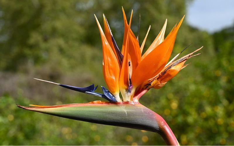 – Flores. Se disponen en inflorescencias terminales protegidas por grandes brácteas que, junto a las estructuras florales, semejan el pico o plumaje de un ave exótica. De condición hermafrodita y forma asimétrica, están formadas por tres sépalos amarillos o anaranjados y tres pétalos azules cubiertos por brácteas laterales sobre largos pedúnculos.