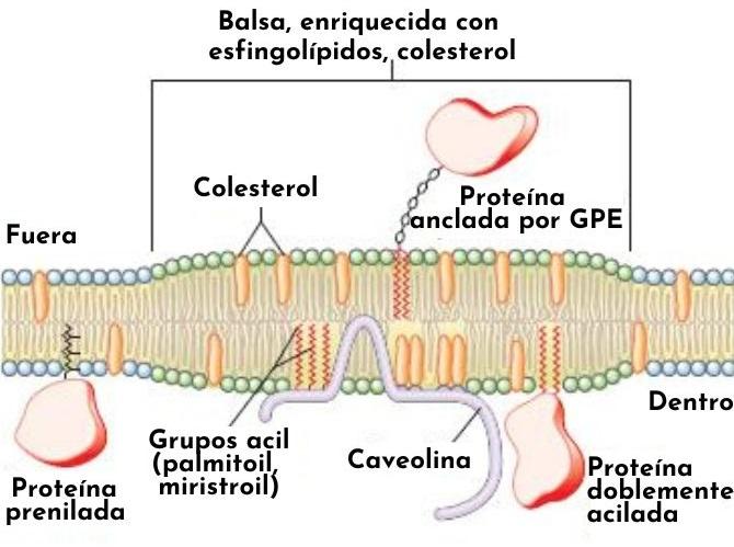 - Balsas caveolas. Son balsas lipídicas representadas como invaginaciones de la membrana plasmática que presentan tamaños que oscilan entre los 50 hasta los 100 nm. Son ricas en proteínas y en lípidos, como el colesterol y las esfingomielinas. Su biogénesis y mantenimiento dependen de proteínas integrales llamadas caveolinas.