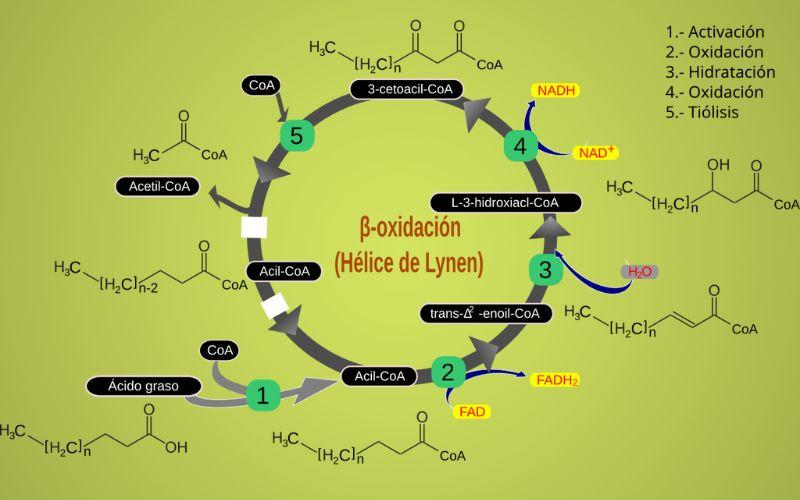 Pasos y reacciones de la beta-oxidación de ácidos grasos