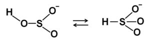 En las soluciones acuosas, el bisulfito forma 4 especies. En solución diluida hay un equilibrio entre las estructuras que se muestran a continuación: