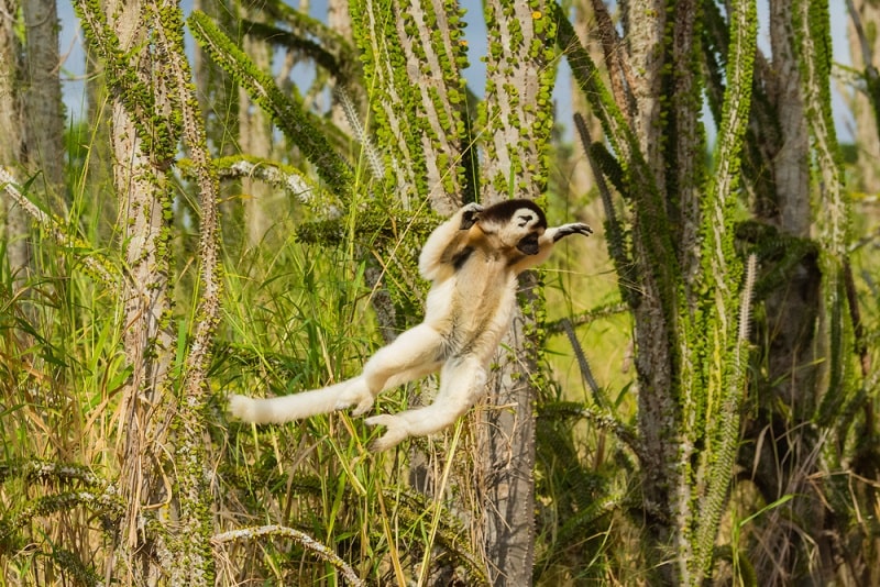 En los bosques espinosos de Madagascar habitan diversas especies de lémures (superfamilia Lemuroides) y el depredador más grande de la isla, la fosa (Cryptoprocta ferox).