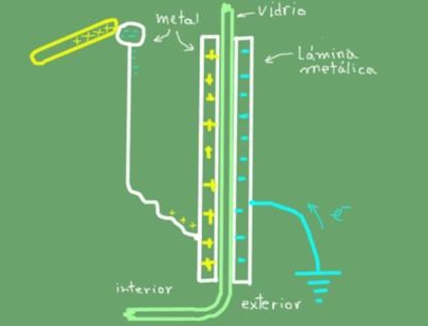 Cuando esta conexión se interrumpe, la placa queda cargada negativamente y cuando se separa la varilla, la placa interior queda cargada positivamente.