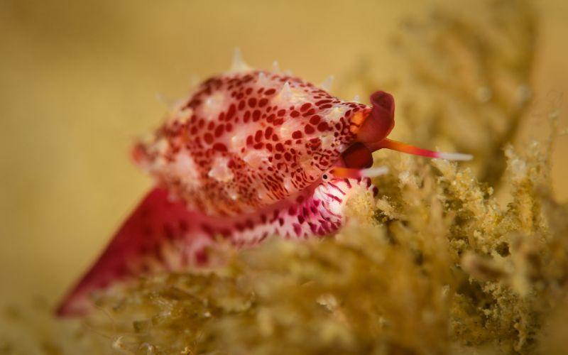 Caracol simnia rojo, un briozoo. Con licencia
