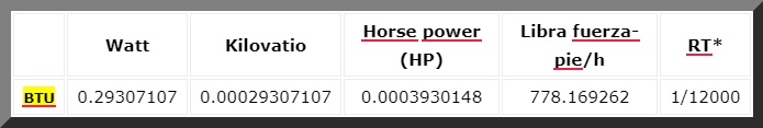Para convertir una cantidad dada de BTU a cualquiera de las unidades mostradas, basta con multiplicar la cantidad por el factor de conversión indicado. Y si lo que se desea es transformar desde cualquier unidad a BTU, se divide por dicho factor.