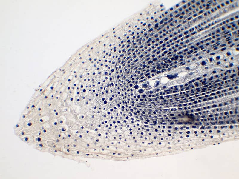 En angiospermas, por su parte, existe en el extremo apical de la raíz un centro de formación estratificado de grupos iniciales de células independientes. De dicho centro se forman diferentes tejidos adultos, como la caliptra y la epidermis, entre otros.