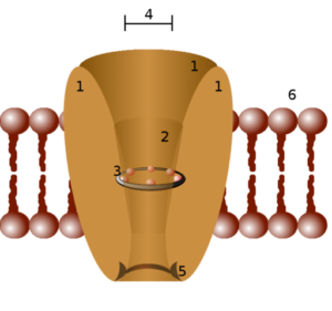 - Estructura proteica de un canal iónico. Típicamente, un canal iónico funcional está compuesto por el ensamblaje de 4 a 6 subunidades polipeptídicas similares (homo oligómeros) o diferentes (hetero oligómeros) que forman un poro central entre ellas. Cada subunidad varía de acuerdo con las características y propiedades del canal, ya que muchos son específicos para iones determinados y poseen mecanismos diversos de apertura y cierre. Algunos canales están conformados por una sola cadena polipeptídica organizada en motivos repetidos, que van atravesando varias veces el espesor de la membrana y funcionan como el equivalente a una subunidad proteica. Además de estas subunidades, conocidas como subunidades α, algunos canales iónicos también poseen una o más subunidades auxiliares (ß o γ) que regulan la apertura y el cierre de los mismos. La especificidad de cada canal está relacionada con el diámetro del poro formado por las proteínas transmembranales y las cadenas laterales (─R) de los aminoácidos que las conforman. De esta manera, existen canales que solo dejan pasar iones de sodio, de potasio, de calcio, y así sucesivamente, pues las cadenas laterales funcionan como “tamiz”.