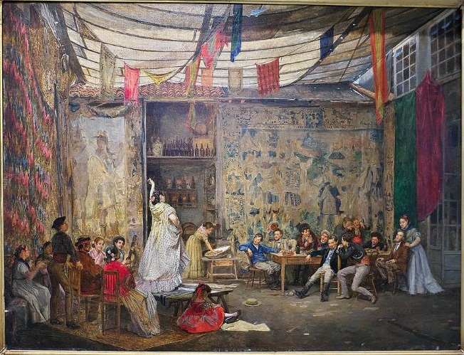 - Pintura romántica. La pintura costumbrista española durante el romanticismo se dividió en dos grandes escuelas: la andaluza, con representantes como Bécquer o Manuel Cabral, que se caracterizó por representar escenas que parecían sacadas de los relatos de viajeros extranjeros. Y el grupo que siguió la inspiración de Goya, con menos influencias exteriores. Según los expertos, la obra de este grupo mantuvo relación con el periodismo costumbrista que entonces se desarrollaba en Madrid.