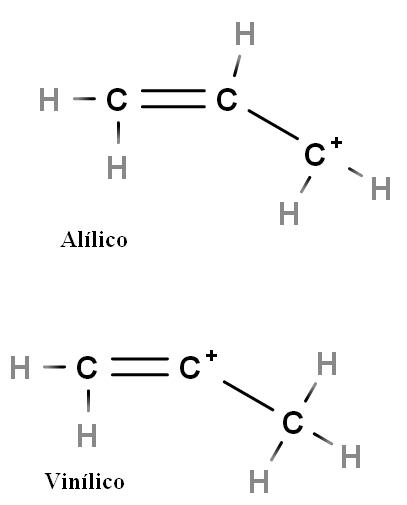 En el carbocatión vinílico la carga positiva se encuentra en uno de los carbonos del doble enlace; mientras que en el carbocatión alílico, la carga positiva se localiza en el carbono siguiente al doble enlace. Basta con sustituir los hidrógenos por otros grupos y tendremos una familia enorme de carbocationes alílicos y vinílicos.