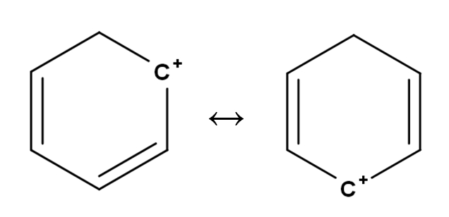 En ellos, la carga positiva se localiza, en principio, en uno de los carbonos de un anillo aromático, como el del benceno. Sin embargo, la carga positiva no está fija, sino que se dispersa en otras posiciones del anillo mediante resonancia.