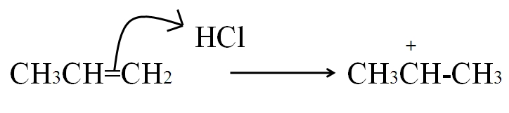 Esta ecuación corresponde a la formación del carbocatión, el cual es un intermediario, no un producto. Los electrones π del doble enlace atacan el hidrógeno del HCl, el electrófilo. El hidrógeno se adiciona al carbono de la derecha del doble enlace, por lo que se forma el grupo -CH3, mientras que el carbono de la izquierda adquiere la carga positiva.