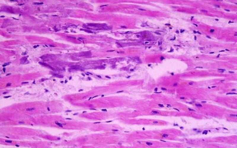 En el examen de tejido necrótico teñido con técnica de hematoxilina-eosina y en el cual se presenta cariorrexis como principal cambio nuclear asociado a la muerte celular, el anatomopatólogo y/o citotecnólogo encontrará cambios característicos que llevan al diagnóstico: