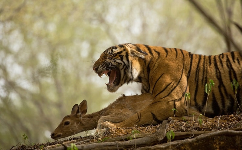 El tigre (Panthera tigris) es un felino depredador carnívoro que habita exclusivamente en las sabanas y las selvas asiáticas. Es un cazador solitario que aprovecha su pelaje para camuflarse y vigilar a sus presas. Se alimenta de jabalíes, pavos reales, búfalos acuáticos, etc.