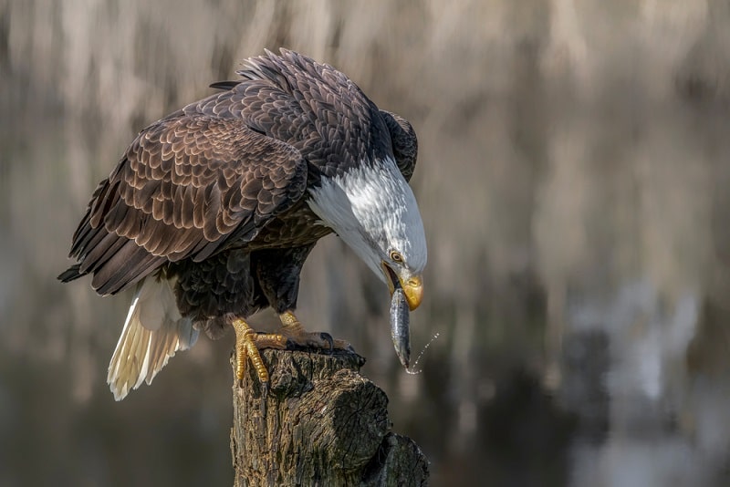 El águila calva (Haliaeetus leucocephalus) habita exclusivamente en América del Norte; se alimenta de peces, roedores, reptiles y de otras aves. Es una cazadora voraz que se posa en los árboles durante horas acechando a sus presas con su increíble visión.