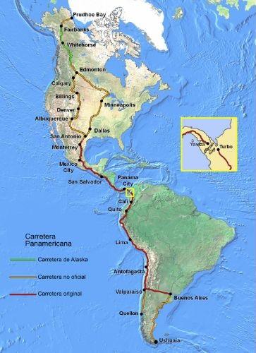– Extensión y recorrido. Se extiende desde Alaska (EE. UU.) hasta Ushuaia (Argentina), cubriendo más de 25 000 kilómetros. Atraviesa 14 países de América, entre ellos: Estados Unidos, Canadá, México, Guatemala, El Salvador, Honduras, Nicaragua, Costa Rica, Panamá, Colombia, Ecuador, Perú, Chile y Argentina. Hay un tramo interrumpido de unos 87 kilómetros, conocido como el tapón del Darién, entre Panamá y Colombia, donde la selva impide la conexión terrestre continua.