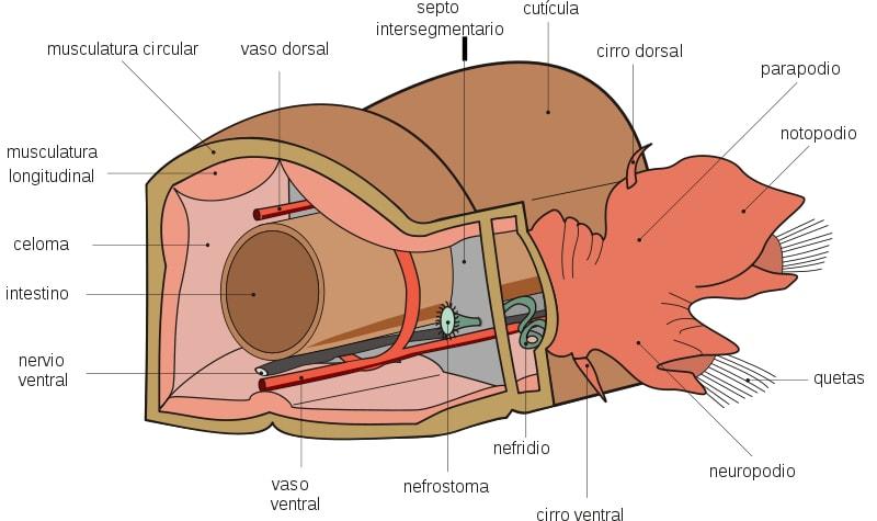 Anatomía de Polychaeta, donde se puede apreciar el celoma.