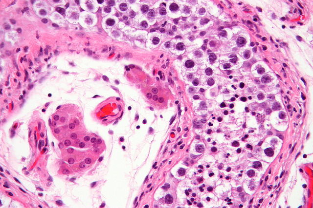 Micrografía electrónica de una neoplasia intratubular de células germinales en los testículos o “seminoma”. Fuente: Nephron CC BY-SA, Wikimedia Commons