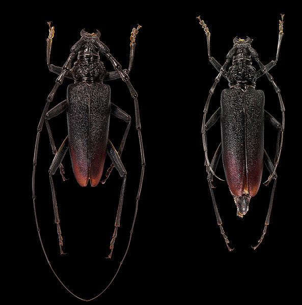 – Antenas. Muy largas, típicas de los cerambícidos, pudiendo superar la longitud del cuerpo en los machos.