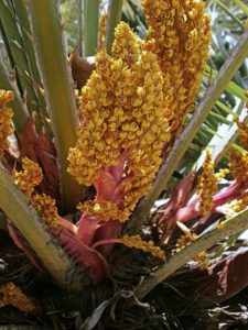 – Flores. Se agrupan en inflorescencias que surgen desde el medio de las hojas. Están cubiertas por una espata de forma cilíndrica, que se abre cuando madura. Son de color amarillo-crema y están dispuestas en espiral sobre el eje de la inflorescencia. La floración ocurre en primavera y los frutos maduran a finales de julio.